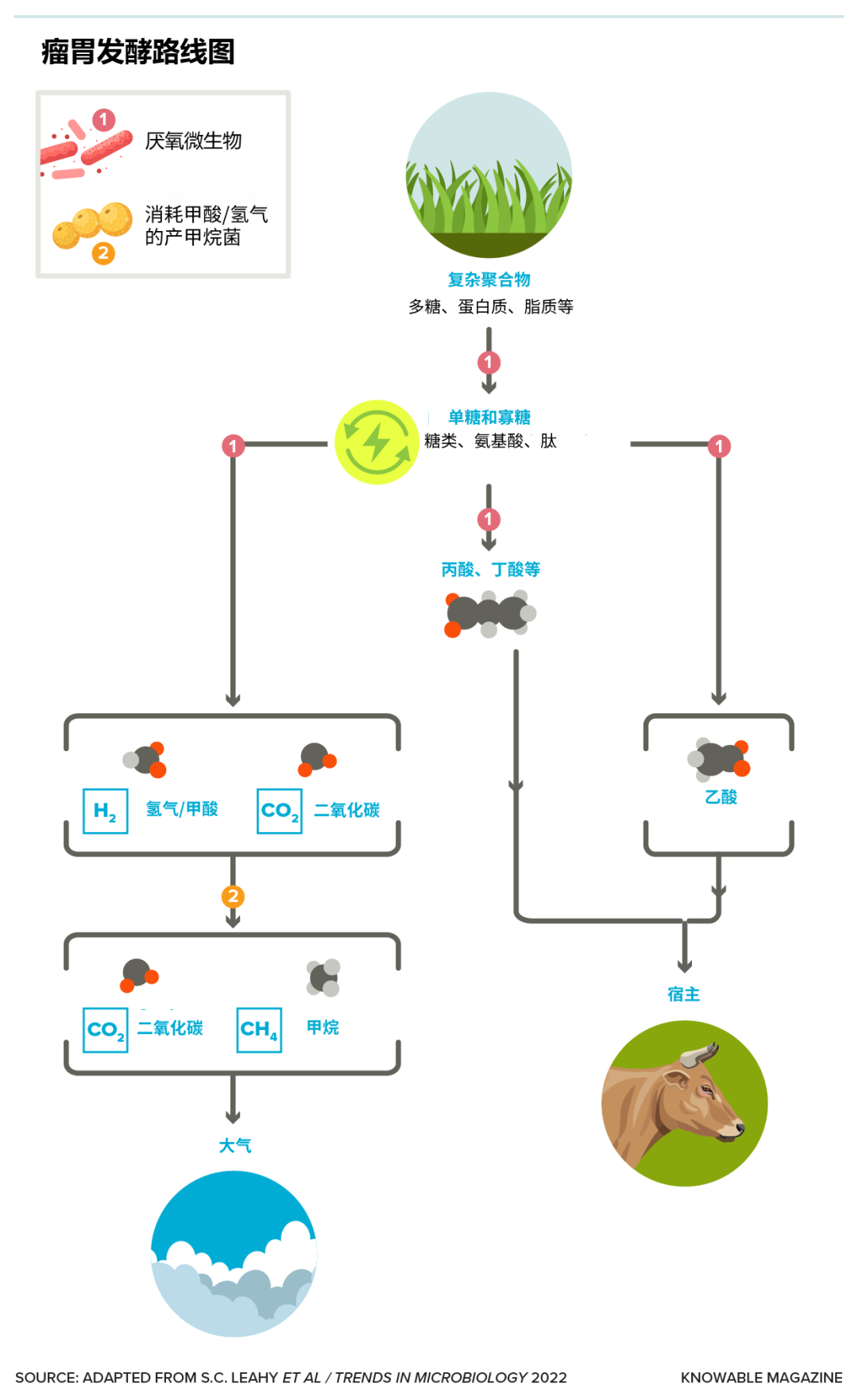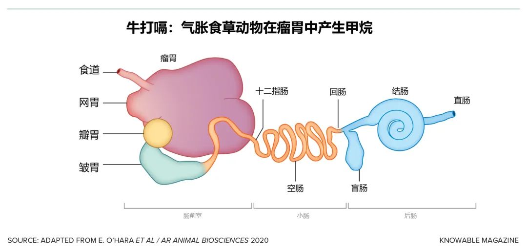 那些消化纖維的微生物——以及那些產生甲烷的微生物——主要生活在瘤胃中。(瘤胃是牛四個胃中的第一個,也是最大的一個)
