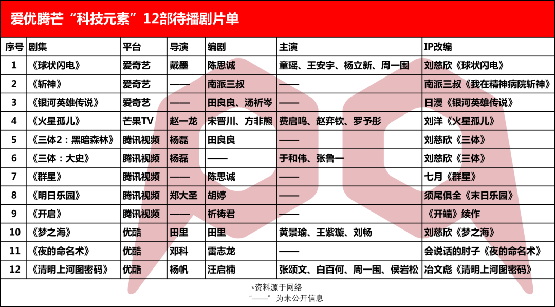 觀察愛優騰芒的待播片單,於內容類型,科幻類作品如雨後春筍般冒出,在待播劇中的比例大幅上升,包括兩部續作《三體2:黑暗森林》《三體:大史》、劉慈欣另外的IP**《球狀閃電》《夢之海》,以及《羣星》《火星孤兒》**等同類IP。