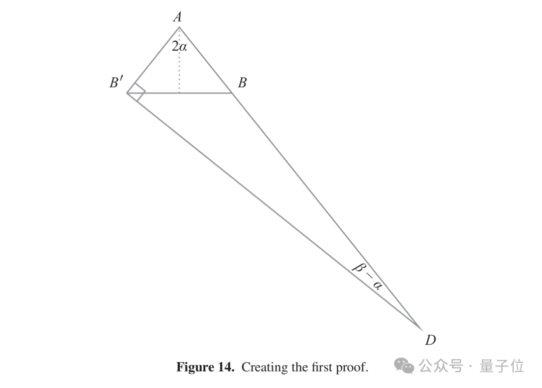 為了在頂點B’處創建一個90度的角度,我們構建一個射線,使其與BB’成α角度。如果我們然後延長邊AB以在點D處與射線相交,我們就得到了我們第一個證明的圖形(圖14)。