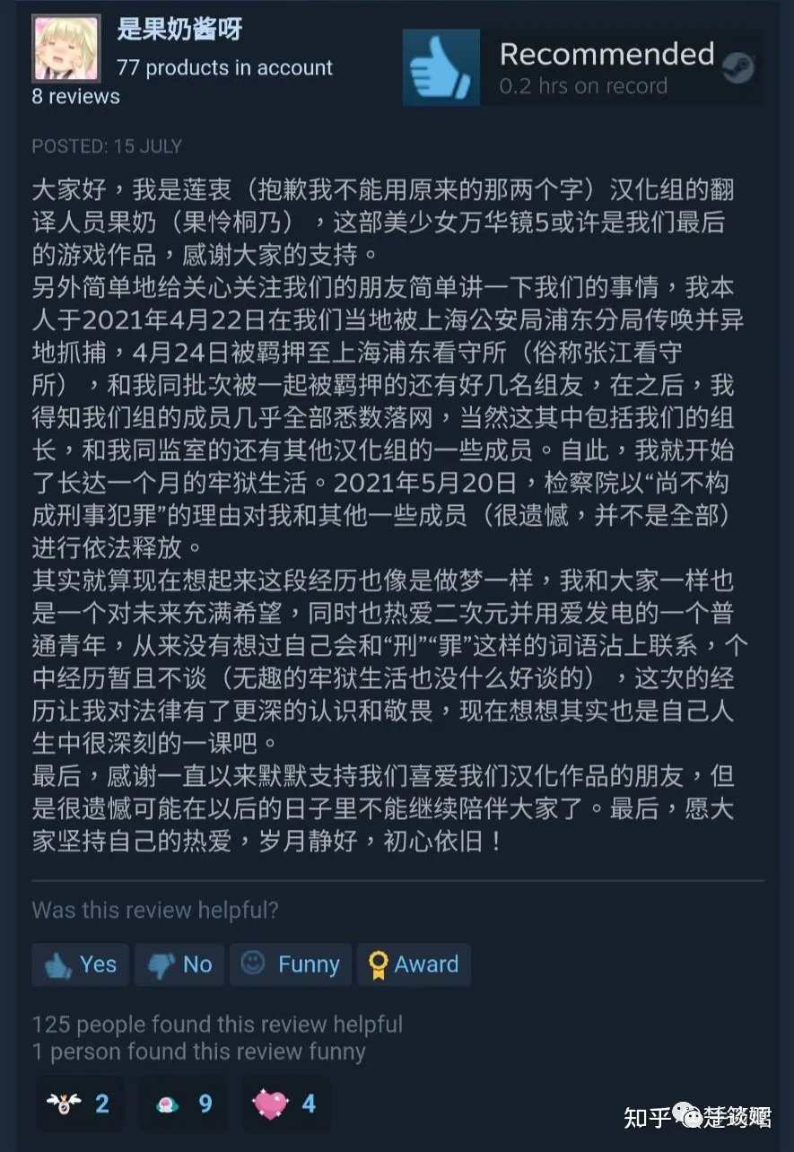 不過,臉腫漢化組在看守所關押了一個月,後因為“不應被追究刑事責任”而取保候審了,並於最近解除了取保狀態。這也是漢化組來説明經歷的原因。