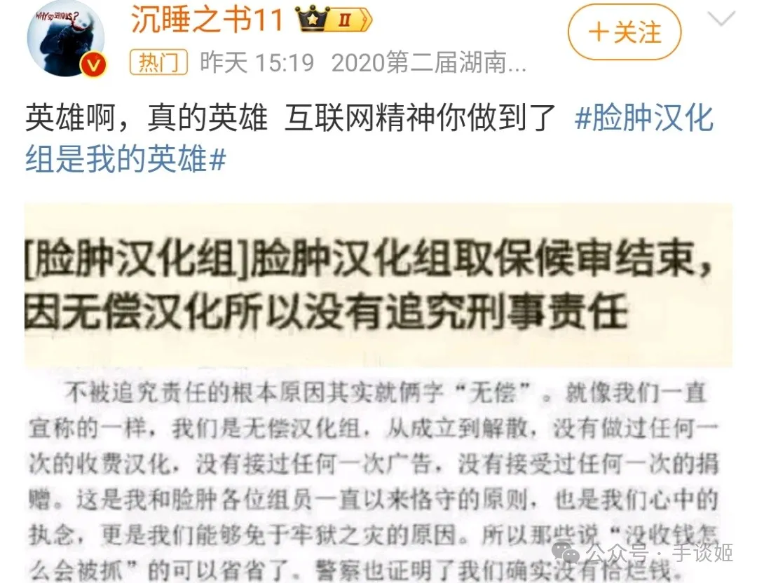 而像臉腫這樣真的什麼也不要的,無疑是一股清流,或者説是曾經大多數漢化組最初的形態。以至於評論區,所有人都站在他們那一邊。