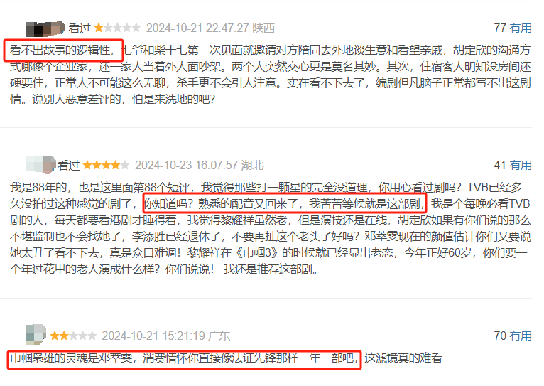 社交媒體上可以看到,目前觀眾的口碑褒貶不一,有詬病劇集邏輯不通的,也有因為TVB配音而懷舊上頭的。還有認真逐條分析“《新聞女王》拉起的TVB口碑,如何被《懸崖》狠狠踩在地上”的劇評。