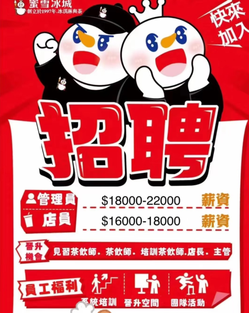 以蜜雪冰城為例。據港媒報道,蜜雪冰城目前在旺角地鋪的店面每月大約需支付20萬港元的租金,以其在售的9港元/杯招牌檸檬水計算,銷量要達2萬餘杯才能基本覆蓋房租。此外,還要面臨高額的人力成本,據其之前在香港發佈的招聘海報,僅一名店長/調飲師的月薪就需1.5-2.2萬港元。
