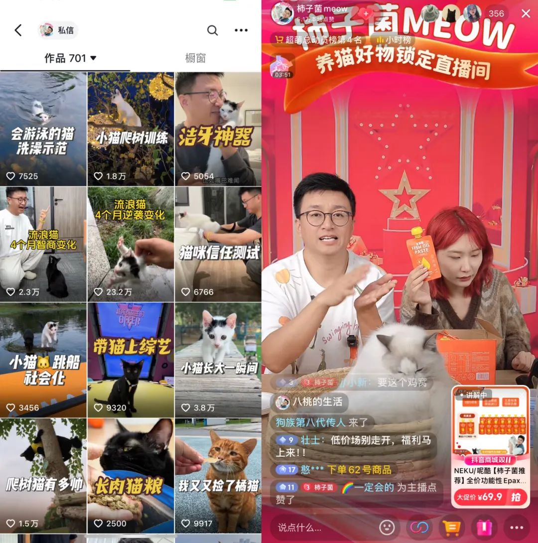 而在日常內容創作中,柿子菌也會在抖音分享自己“貓咪社會化訓練”等內容,涉及“帶貓騎行真可以”“貓咪游泳闢謠”等養寵人關心的話題,這些晦澀難懂的科學養貓知識被他以更幽默輕鬆的方式表達。