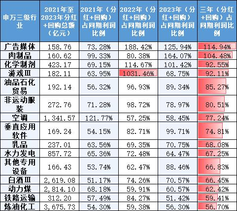 2021年至2023年,廣告媒體和肉製品行業,三年分紅加回購之和,佔同期總利潤的比例超過了100%,分別達114.94%和104.48%。