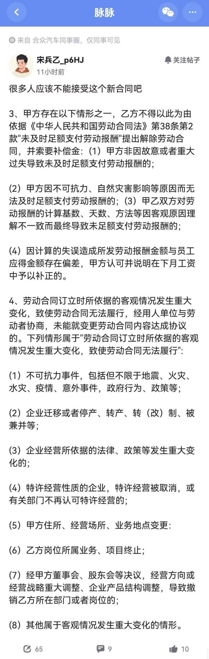 據職場社交APP脈脈上“合眾汽車同事圈”網友爆料,哪吒新合同上列示了諸多乙方不得以此為由依據《中華人民共和國勞動合同法》第38條第2款“未及時足額支付勞動報酬”提出解除勞動合同,並索要合同金的條款。