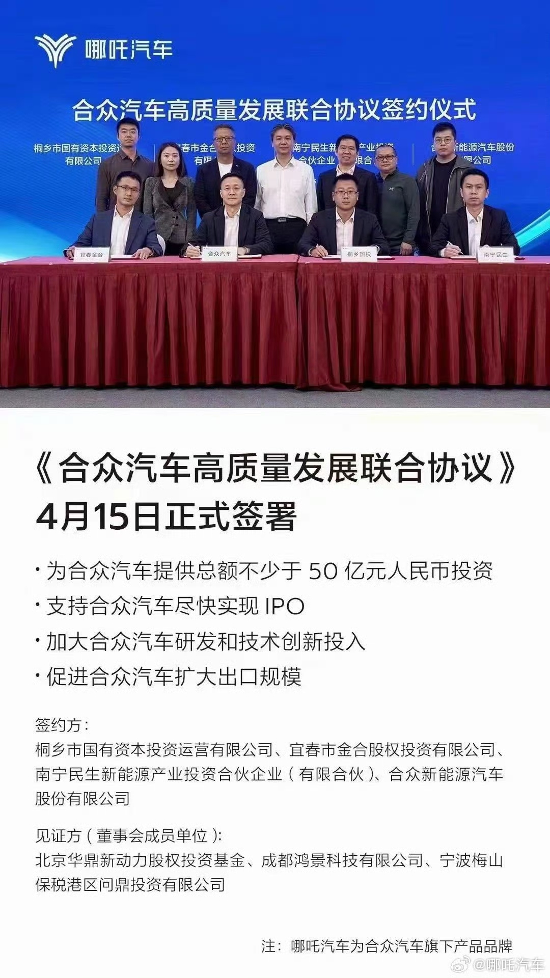 今年4月15日,哪吒汽車在其官方微博宣佈獲50億元投資。雖然同一時間哪吒放出來的《合眾汽車高質量發展聯合協議》細則,列示了支持儘快實現IPO、加大研發和技術創新投入、促進擴大出口規模等內容。但哪吒自己提取的關鍵句,揭示了本次的投資或是以哪吒實現IPO為前提。