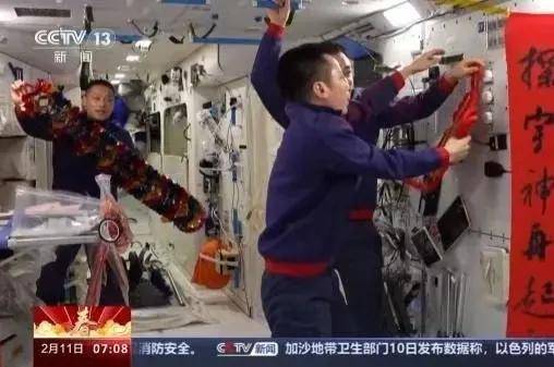 神舟十七號乘組湯洪波、唐勝傑、江新林首次在太空度過龍年春節。大年三十,航天員特意穿上了喜慶的“祥雲服”,貼上了春聯,掛起了燈籠,把中國人自己的“太空家園”裝扮得年味兒十足。
