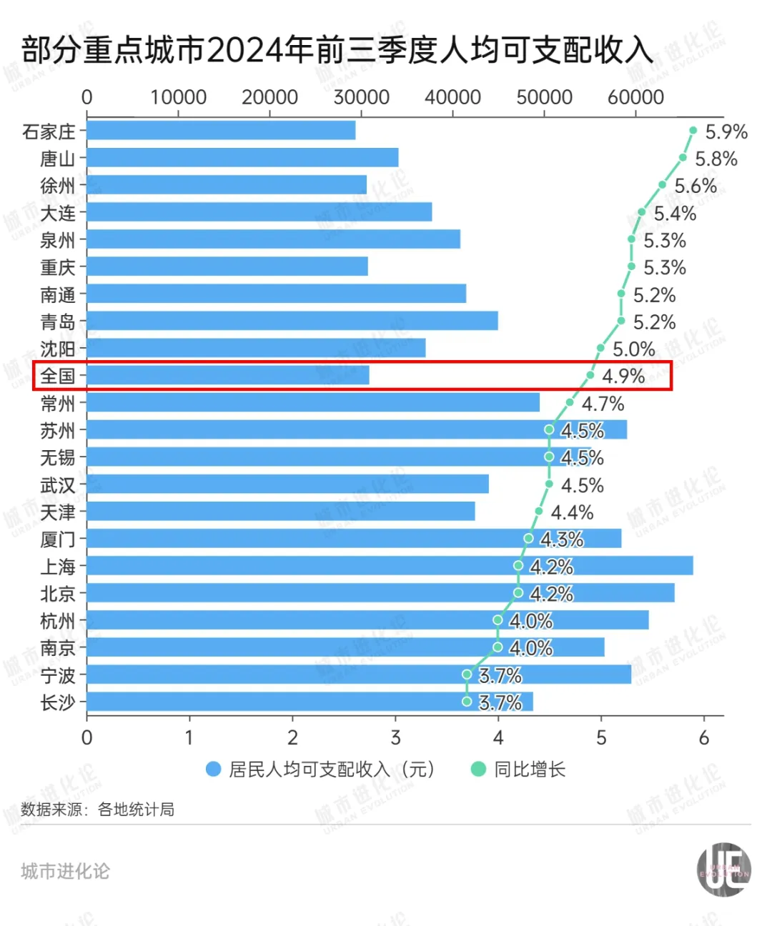 從實際情況來看,居民增收仍有空間。部分城市公佈了前三季度人均居民共支配收入,石家莊、唐山、徐州、大連等城市增速較高,北京和上海均低於全國水平,長沙和寧波僅增長3.7%。