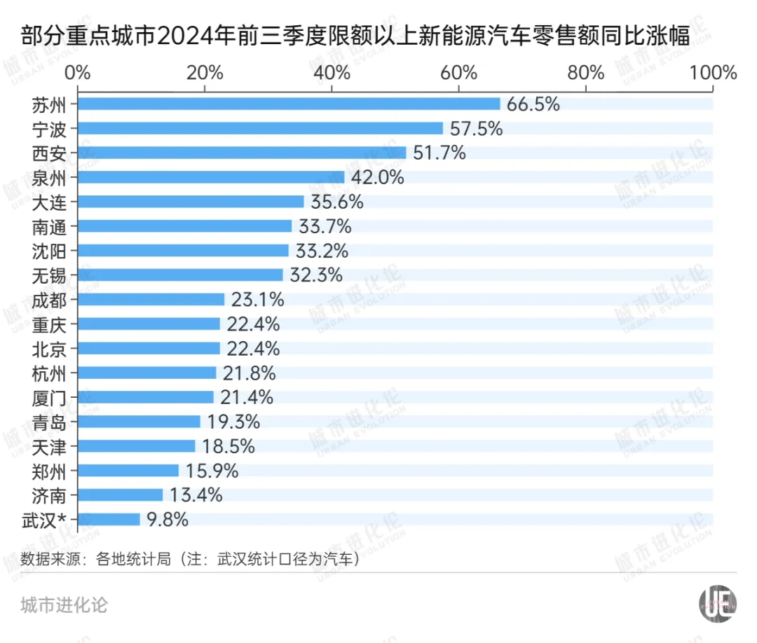 寧波、西安、泉州、大連等地的新能源車銷售額漲幅也較高,瀋陽、青島、東莞、重慶等城市的家電和音響器材零售額上漲較快。