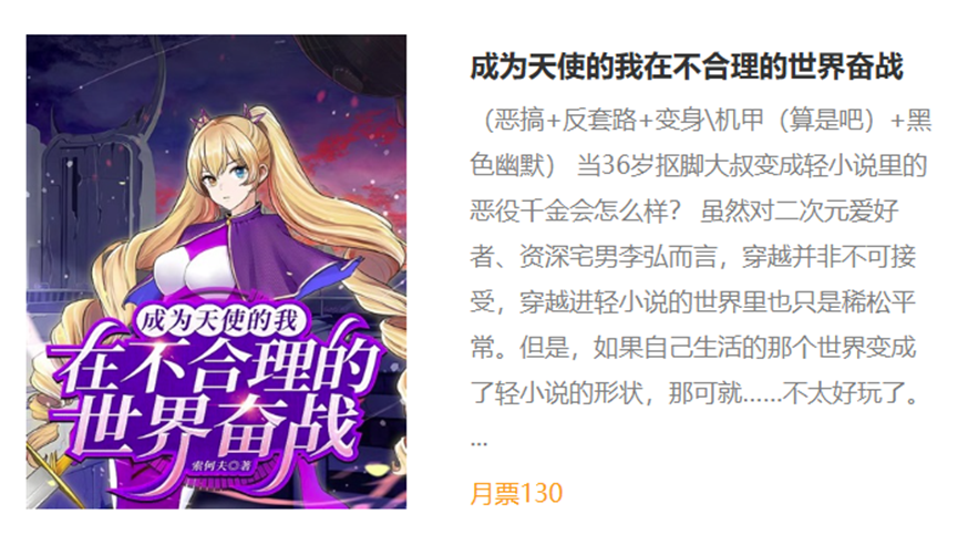 他是輕小説平台菠蘿包的簽約作者。目前他手裏共有兩部SF題材的輕小説正在連載,其中一部講的是36歲摳腳大漢性轉成為美少女在異世界展開冒險;另一部則是變成智能防具的軍宅在異世界養女兒的故事。先不談這兩部作品夠不夠科幻,起碼二次元濃度這塊已經拉滿。