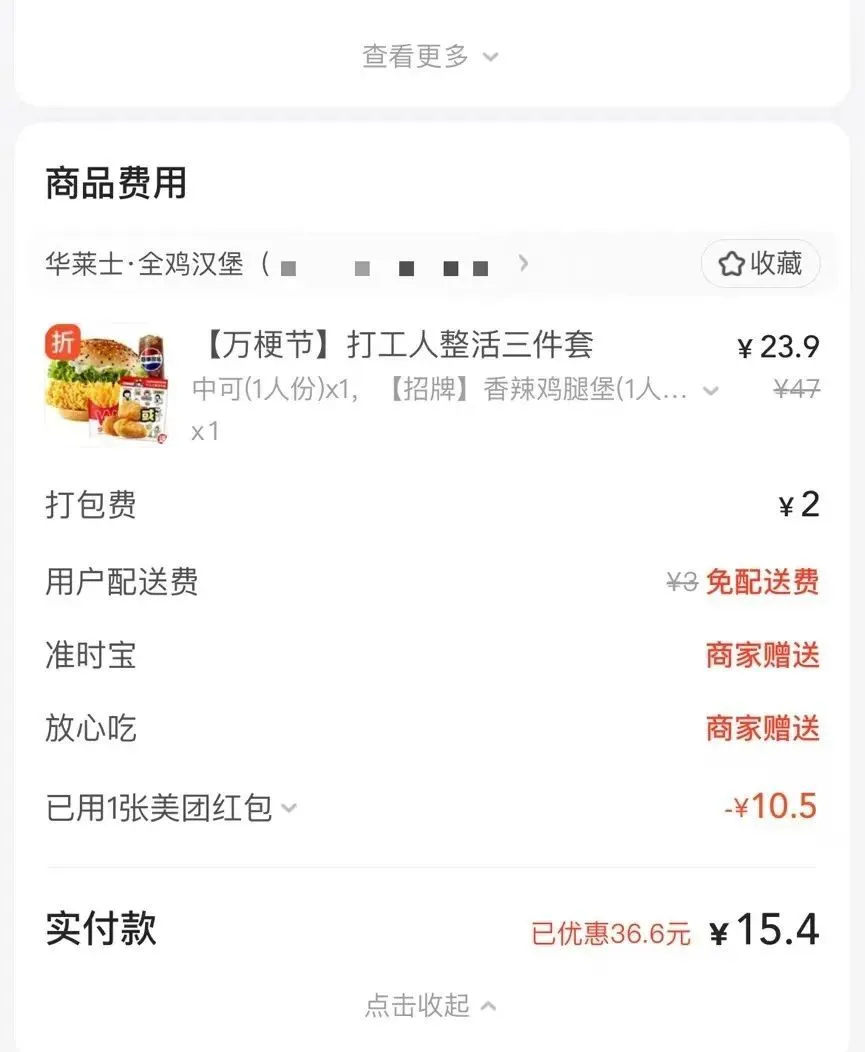“常吃漢堡的人都知道,今年很多漢堡門店都在搞促銷。前幾天,我在華萊士點了一份‘萬梗節打工人整活三件套’套餐,包括一個香辣雞腿堡、一份香酥孜然雞柳加一杯中可,一共才花了15.4元,比中午在沙縣吃的雞腿飯還便宜。”北京白領温妮介紹。