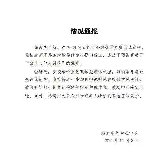 隨着阿里官方公佈了結果,漣水中專也公佈了對指導老師王閏秋的處理決定: