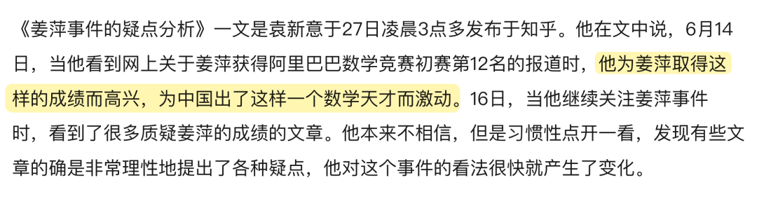 哪怕北大教授袁新意在看到報道時,也是 “ 為姜萍取得這樣的成績而高興,為中國出了這樣一個數學天才而激動 ” 。