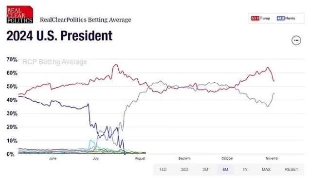 不僅如此,博彩市場也在積極配合,幾周前,川普的勝率高達66.1%,哈里斯的勝率只有34%,川普領先超過 30個百分點。而在大選前三天,川普的勝率瞬間下降到53.8%,哈里斯的支持率則上升到44.8%。
