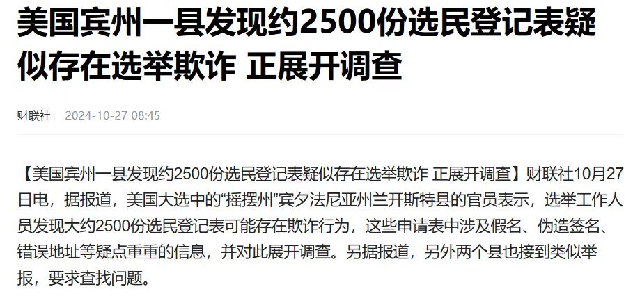 8. 10月27日賓夕法尼亞州的蘭開斯特縣發現2500份可能的選民登記欺詐行為。這事爆出來,是因為共和黨控制了這個縣。可以想象,在搖擺州民主黨控制的縣,有多少選舉欺詐事件發生。只要敢於鑽漏洞,民主黨絕對可以確保搖擺州湊到270票獲勝。這也解釋了近來詭異的氣氛。