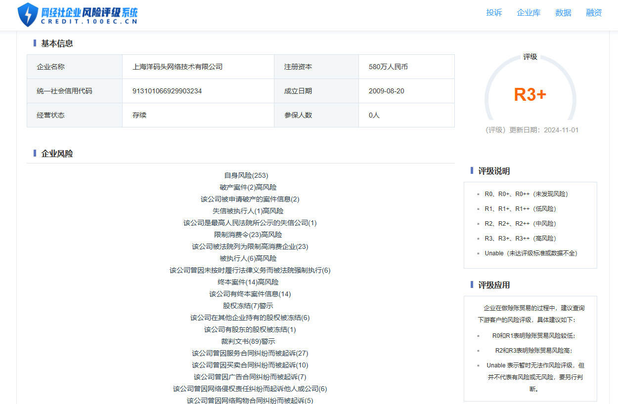 據“網經社企業風險評級系統”顯示,洋碼頭隸屬於上海洋碼頭網絡技術有限公司的風險評級為R3+,公司目前所處高風險。