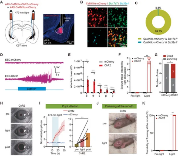 光遺傳學激活pBLA穀氨酸能神經元會引發癲癇症狀甚至死亡(圖源自Advanced Science )