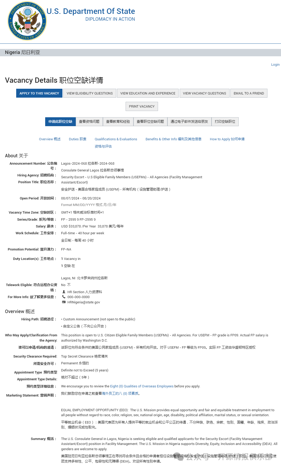 多樣性議程已轉化為世界各地大使館的日常運作。一些大使館甚至正在篩選安全崗位是否遵守DEI。例如,在美國駐拉各斯總領事館的安全護送職位招聘啓事中,申請人被告知“美國駐尼日利亞使團支持多元化、公平、包容性和無障礙(DEIA)”,並且“歡迎所有性別申請”。工作總結中大約三分之二的內容是專門針對DEI的。