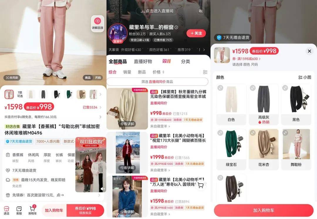 高端羊絨成衣品牌藏裏羊創始人李建紅夫婦,通過直播在在源頭工廠介紹羊絨服飾的穿搭、辨別方法和打理方式,積累了海量粉絲。一款名為“香蕉褲”的針織褲在為爆款後,直播間的買家大都會去店鋪裏回購。所以,李建紅夫婦越來越重視貨架場,早早開始始精細化運營貨架場:第一,銜接內容場和貨架場,在直播中打造爆款,把驗證過的爆款在店鋪裏上架,第二,持續擴充商城品類,除了主打的羊絨產品,擴充了羽絨服、半身裙和襯衫、女鞋等品類,貨架場延續品牌優勢和用户的信任,滿足用户更多季度、更多品類的需求。