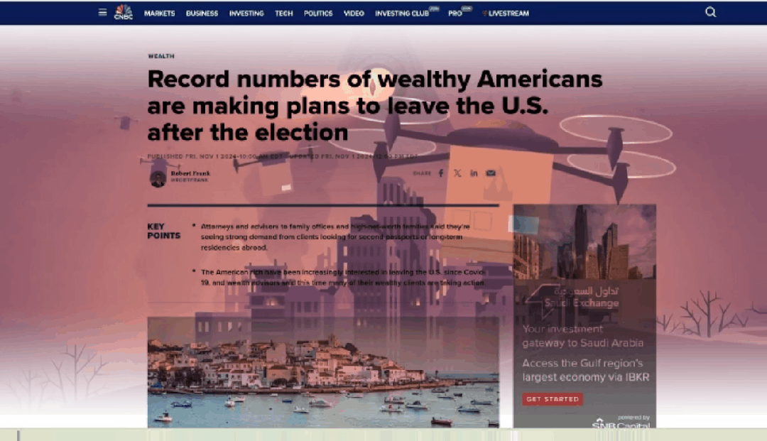 CNBC的報道指出,越來越多的美國高收入人士計劃移居海外,對第二本護照或海外長期居留權的需求達到新高。