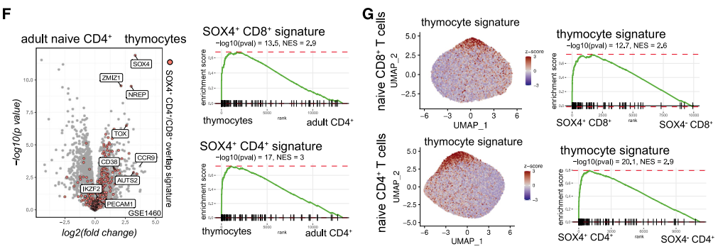 首先,SOX4+幼稚T細胞高表達IKZF2、TOX2因子,這些因子參與T細胞胸腺分化成熟的過程[8; 9],與RTE的功能也緊密相關。