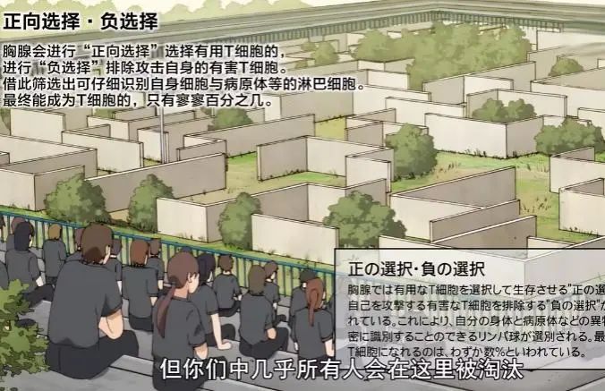 圖注:見習T細胞(幼稚T細胞)還在“胸腺學校”內學習正向選擇與負選擇,圖片源自動漫《工作細胞》