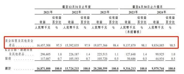 而2021年-2023年及2024年上半年,黃金珠寶及其他黃金產品的收入佔公司總收入的比例分別為97.5%、97.9%、98.4%和98.5%。