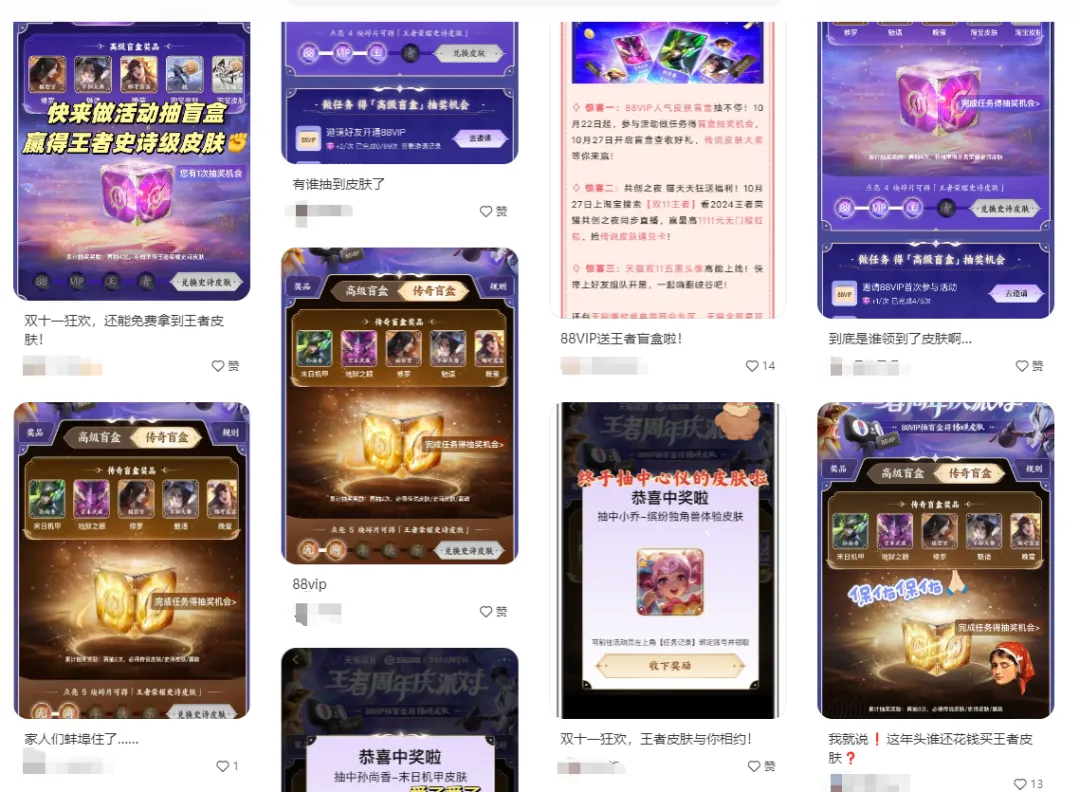 可以看到,在小紅書、微博、貼吧等互聯網平台上,為了雙十一活動抽免費皮膚的玩家不在少數,乃至還有人發出感慨,“原來雙十一除了花出去錢以外還能賺回來?不像之前某些抽獎一樣坑爹,這次可是百分百中獎,家人們還等什麼!”