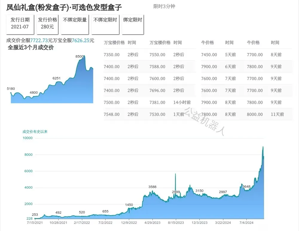 唐棠還記得,7月份的新外觀裏有一個顏色很獨特的蘭陵盒子,官方還沒有爆料的時候玩家們都在猜新門派可能會是綠色,所以就把這個綠色系盒子的價格給帶起來了,一度炒到上千塊,“當時我們這個交易羣裏囤了幾十上百個的都有,可惜後續官方消息一出,新門派是金紅色,瞬間把這個盒子打回到600多塊,雖然也比發行價漲了一百多,但那些追漲的人確確實實是被收割了。”