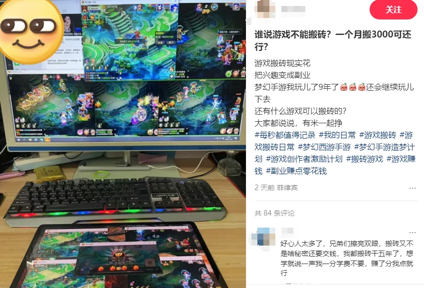 更甚者,“肝帝們”還會瞄準遊戲需要日活用户這個痛點,主動花費大量時間和精力在遊戲裏“搬磚”打金,以填平自己的遊戲消費或者直接將之當成副業開始賺錢。