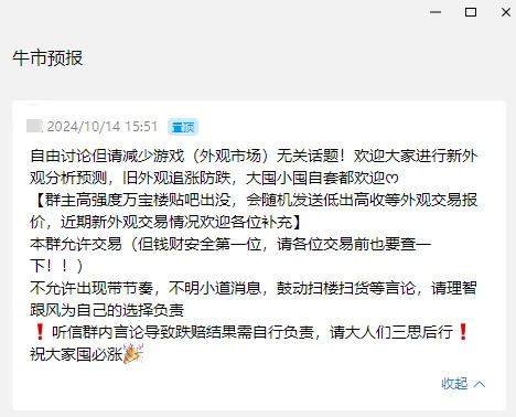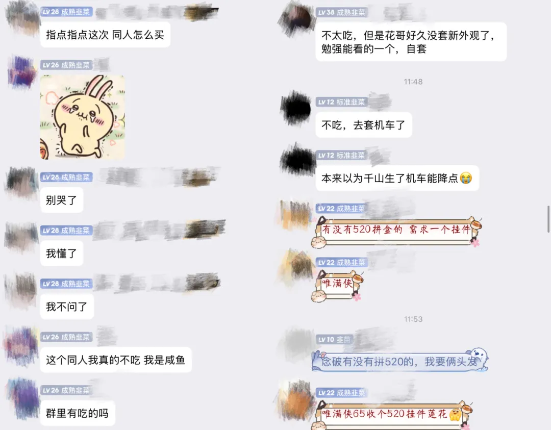 “就拿我進的這個玩家羣來説吧,大家每天都在激情分析外觀行情,從官方渠道萬寶樓、玩家聚集地貼吧,以及劍三製作人微博這些地方收集情報,預測新外觀實裝表現,從各方面的是分析適配度,討論它是不是會漲”,唐棠坦言,能搶到官方一手貨源當然最好,搶不到也可以根據遊戲動態推測之前某個外觀是不是還能漲,估準了追漲也能賺不少。