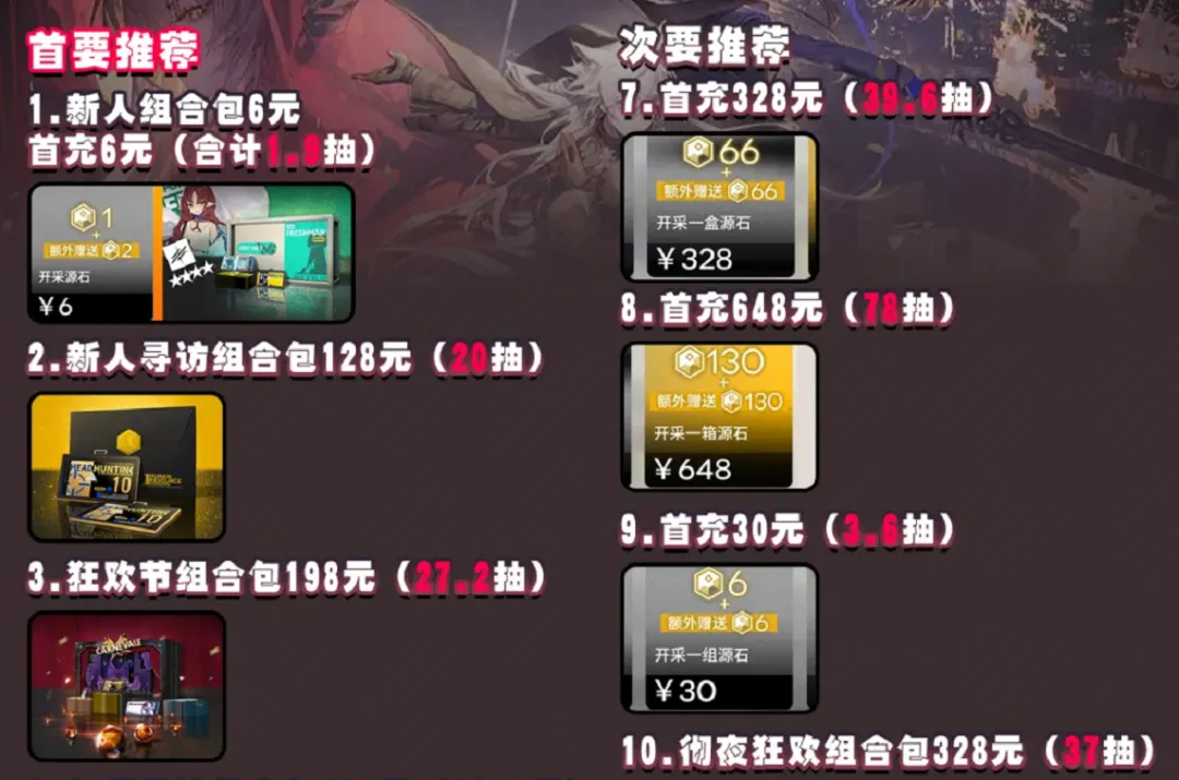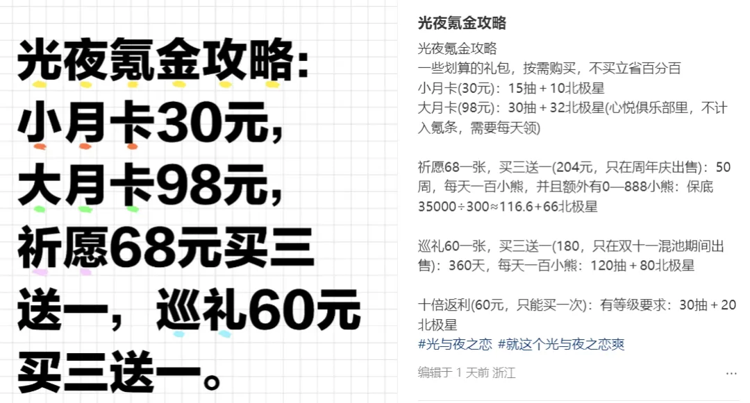 “光與夜之戀最近的禮包簡直是眼花繚亂,68+128的禮包30號就下架了,混池之前的禮包大概是能有80抽的樣子,雙十一禮包性價比更高的估計大概只有98+198了,這個有60抽,那麼需要從禮包上額外獲得多於100抽的都可以先買起來啦!”