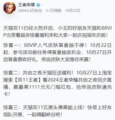 “別想,衝就完了!”王者榮耀鐵桿粉趙藝詩就是為遊戲雙十一活動高舉贊同大旗的代表之一,“再説了,電商還有618、818、雙十一、雙十二以及各種品牌店慶做替補,但遊戲裏漏掉某些特殊福利活動可能真的要等一年,比如説王者週年皮膚,錯過的話只有等下一個週年的返場,或者等之後大型活動概率出。”
