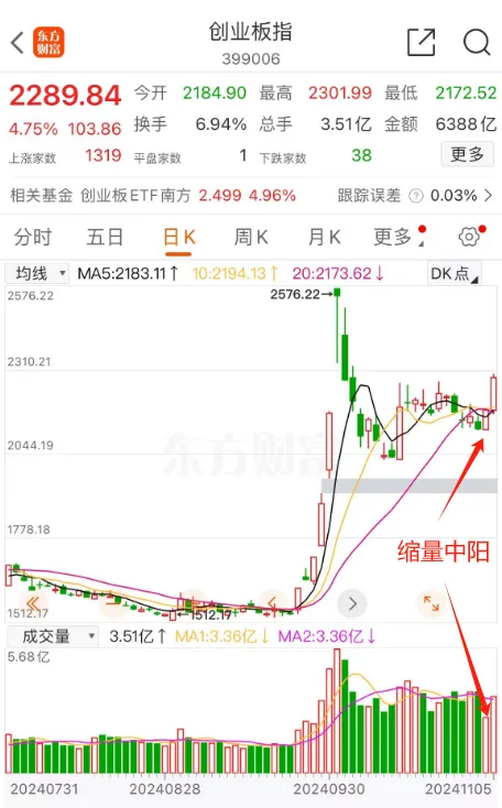週一的時候大盤也以實際走勢證明了這一點,週一的時候創業板是縮量漲2.93%,同一日大盤其實也縮量漲了1.17%,收3310點。