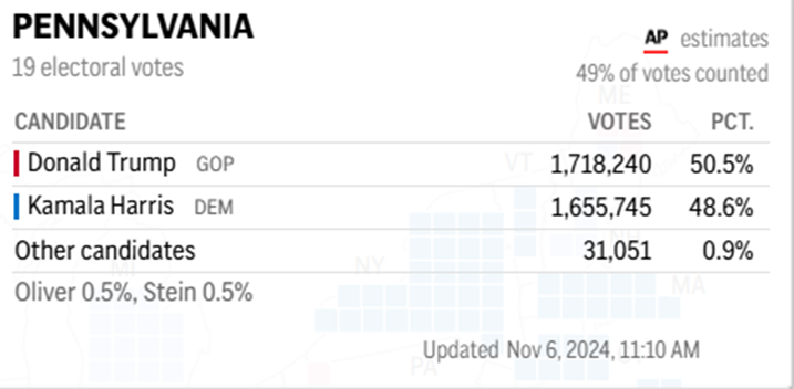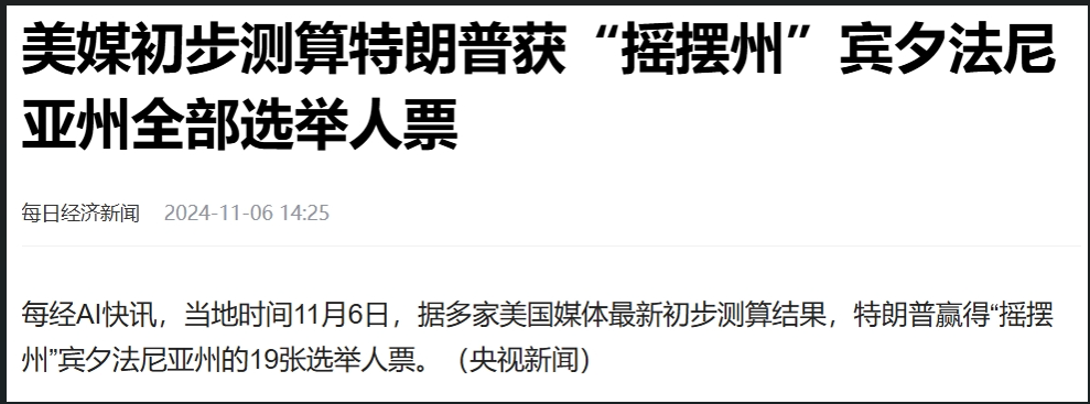 到了6日下午2點半,據多家美國媒體最新初步測算結果,特朗普將贏得賓夕法尼亞州。