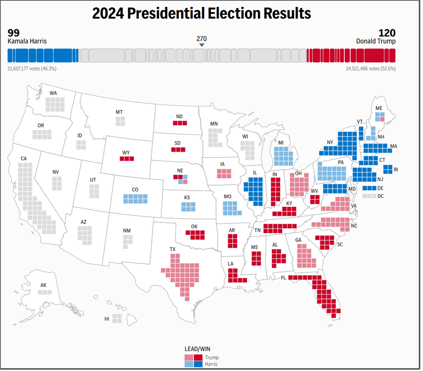 早上10點的時候,美聯社的即時統計是哈里斯獲得99票,特朗普獲得120票。