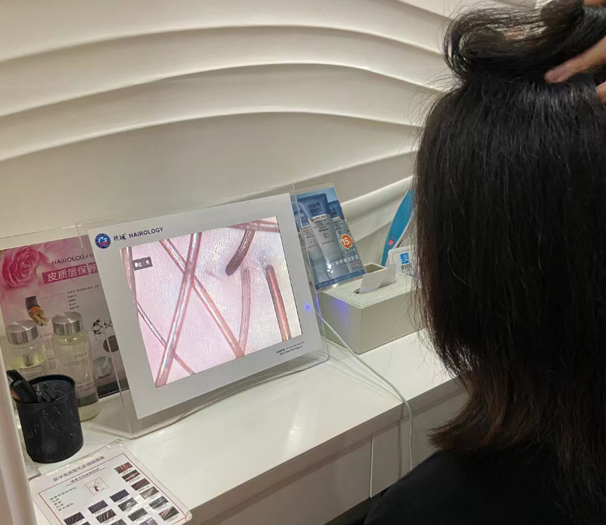 通過頭皮檢測儀的放大處理,可以清晰地看到頭皮、毛囊、頭髮、發乾的健康狀態,頭髮稀疏、毛囊萎縮等狀況一目瞭然。