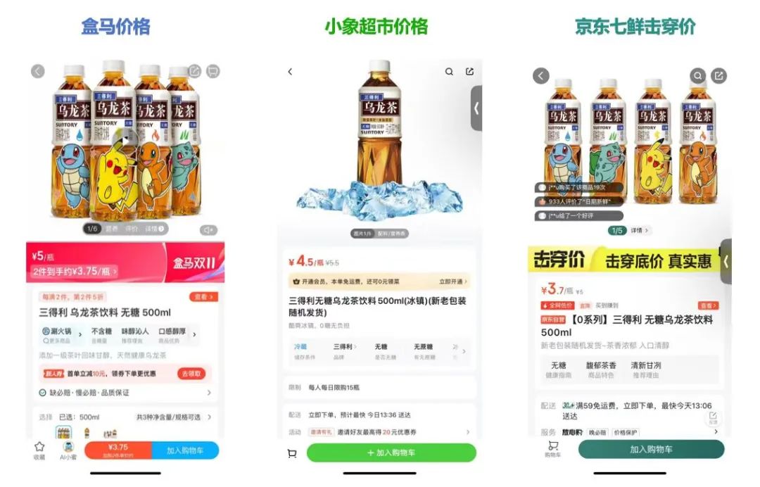 三得利的無糖烏龍茶500ml裝,京東七鮮跟盒馬已經打了好幾輪。
