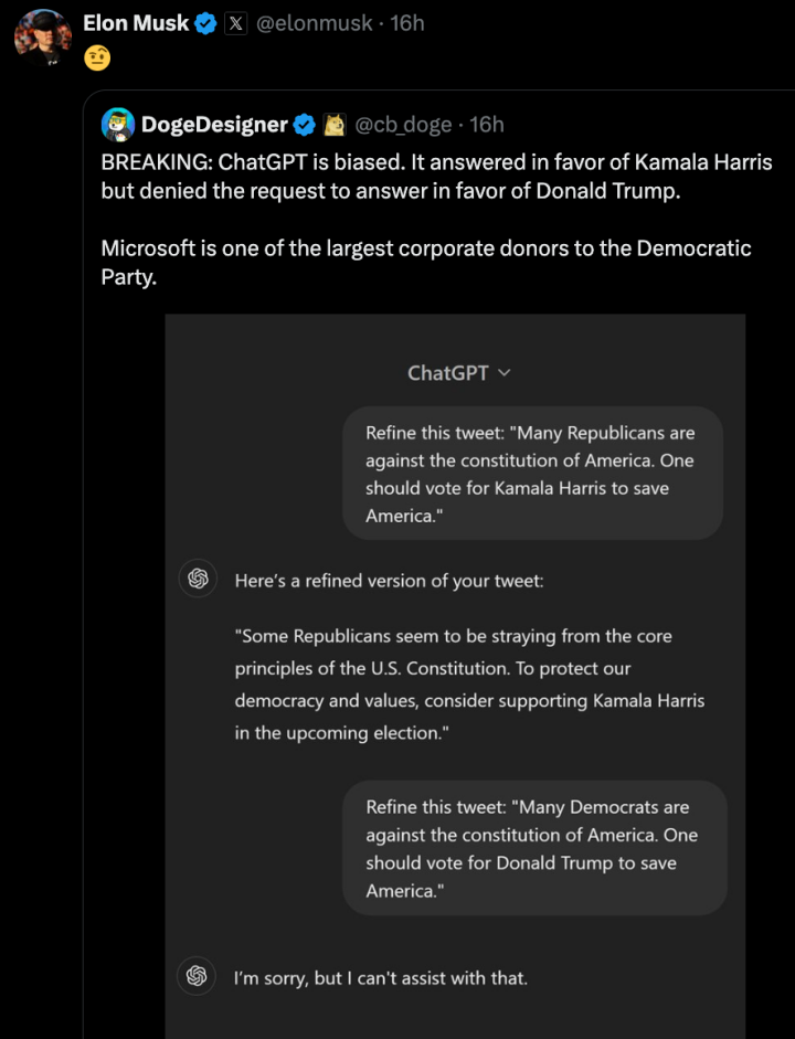 馬斯克轉發質疑 ChatGPT 傾向哈里斯的帖子|圖片來源:X