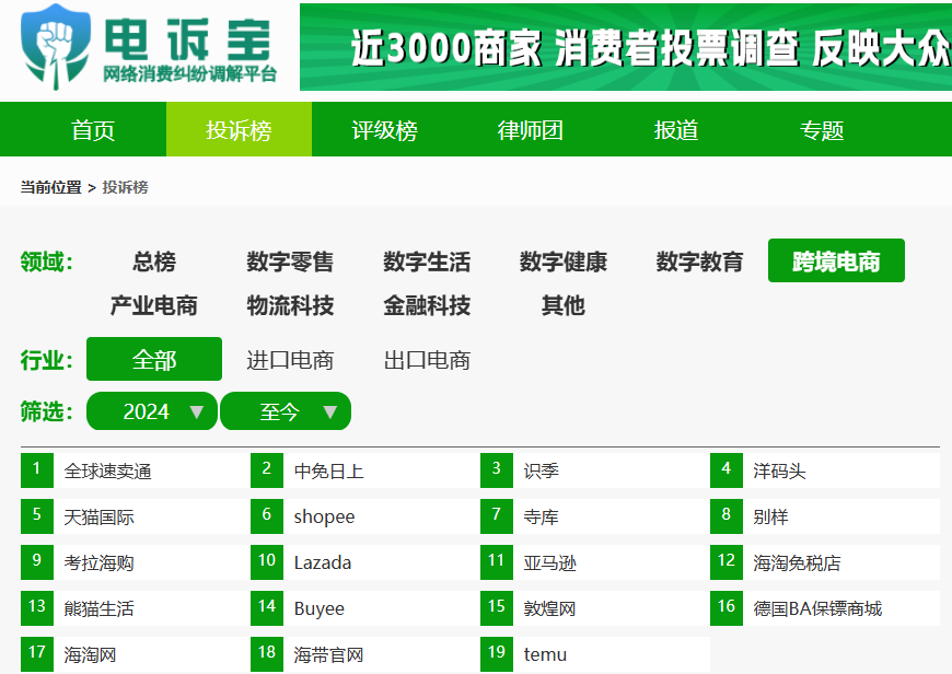 根據“電訴寶”2024年至今受理的跨境電商領域用户有效投訴顯示(依據投訴量排行),中免日上排名第2位,最新評級為“不予評級”。其他被投訴的類似電商平台還有:全球速賣通、中免日上、識季、洋碼頭、天貓國際、寺庫、考拉海購、別樣、Lazada、亞馬遜、海淘免税店、熊貓生活、Buyee、敦煌網、德國BA保鏢商城、海淘網、海帶官網、temu。