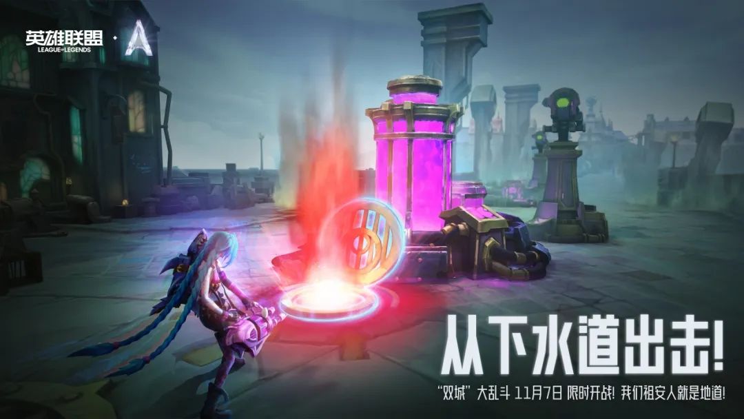 新的大亂鬥地圖,完整地將雙城之戰的敍事背景搬到了《英雄聯盟》當中。雙方不再是沒有任何背景的紅藍方,而是分別代表皮城和祖安:兩頭也有不同的解説員和店主供玩家購買裝備,兩邊的地圖美術風格和環境敍事都截然不同,例如祖安一方抵達戰場中央走的就是下水道,草叢也變成了更符合雙城背景的通風口煙霧。