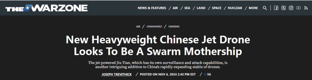 因此中國的“九天”大型無人機在此方面的優勢就非常明顯了——它採用噴氣動力,遠比採用螺旋槳動力的常規無人機飛得快;起飛重量大、有效載荷能力強,意味着可以攜帶體積相對較大、數量更多的蜂羣無人機,完成任務的能力更強;採用無人機為“航空母機”的投送平台,不但免去了遠距離飛行的疲憊,而且即便在執行高風險任務時被擊落,也沒有人員傷亡的擔憂。
