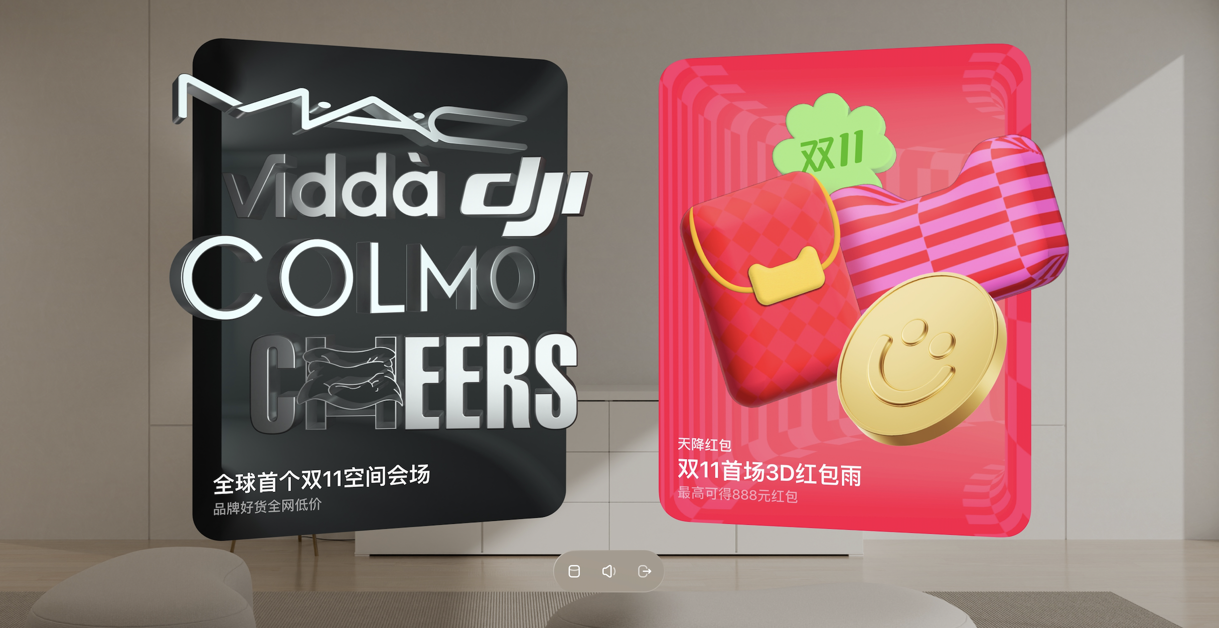 這次雙11空間會場就創造了一種很新的購物方式:用户可以穿過黑科技築造的“任意門”穿越到未來,虛擬操控大疆無人機、疊放COLMO的冰箱空調洗衣機、模擬播放Vidda投影儀,獲得前所未有的新奇體驗。