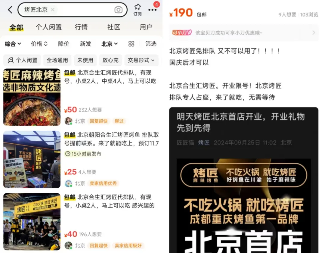 如此排隊“盛況”也吸引來了一批倒賣用餐號的“黃牛”。據瞭解,烤匠北京店開業初期,黃牛號一度炒到300元一張。截至11月5日,某二手平台顯示,有關“烤匠北京店代取號/免排隊”的相關購買鏈接超110條,號價在25-190元不等。