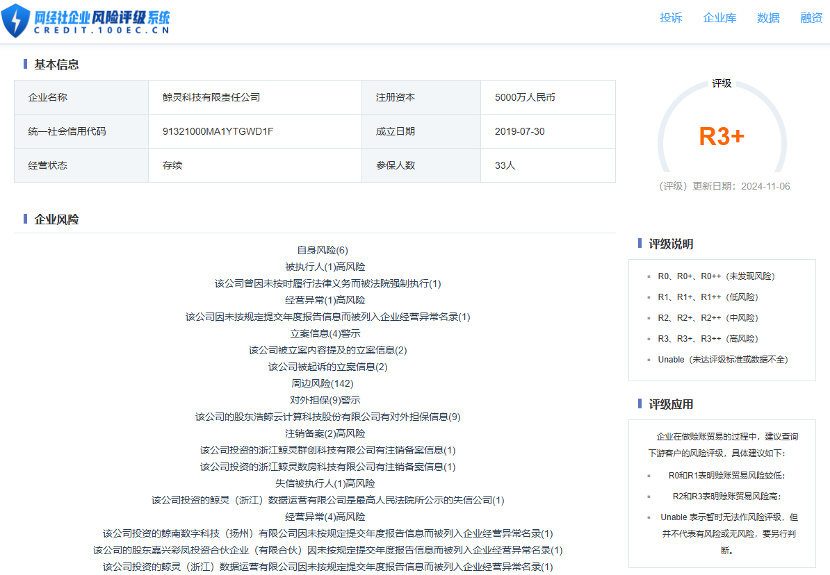 據“網經社企業風險評級系統”顯示,“蜂享家”隸屬於鯨靈科技有限責任公司的風險評級為R3+,公司目前所處高風險。