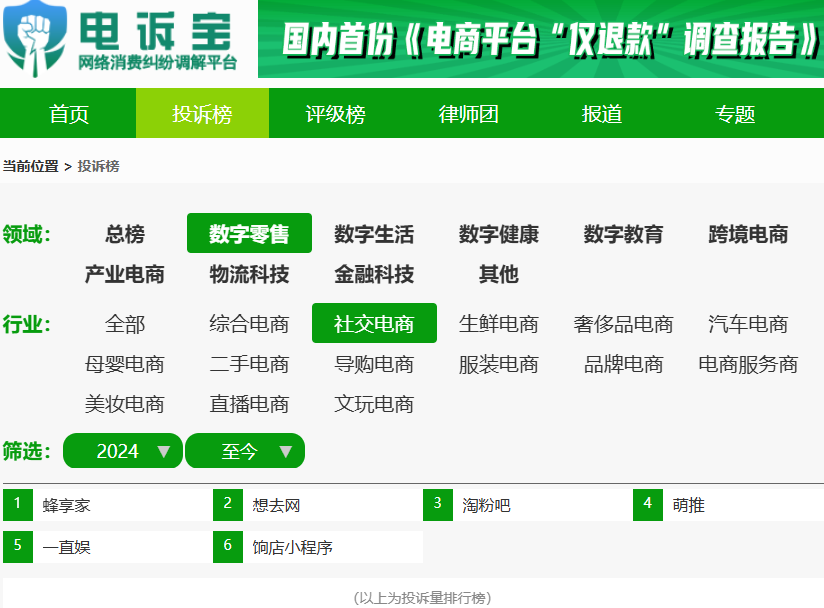 根據“電訴寶”2024年至今受理的社交電商領域用户有效投訴顯示(依據投訴量排行),蜂享家排名第1位,最新評級為“不建議下單”。其他被投訴的類似電商平台還有:想去網、淘粉吧、萌推、一直娛、餉店小程序。