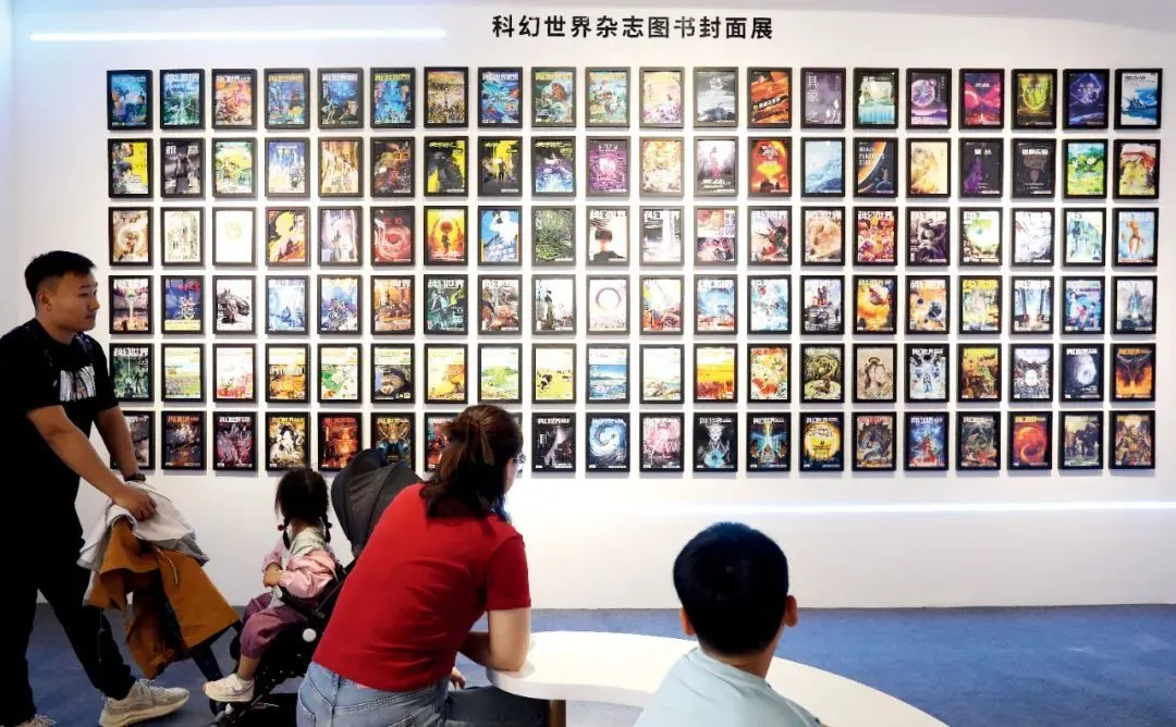 4月27日,北京科學中心“首都青少年科幻教育空間”主題展覽上的《科幻世界》雜誌封面。圖/中新