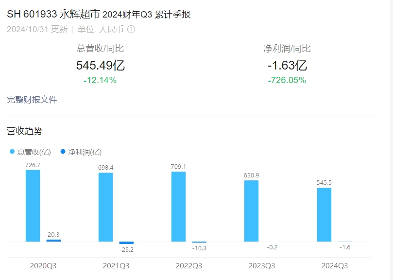 永輝超市今年第三季度歸母淨利潤為-3.53億元,同比虧損擴大。毛利率方面,永輝超市第三季度毛利率19.19%,較上年同期下降了1.69個百分點。