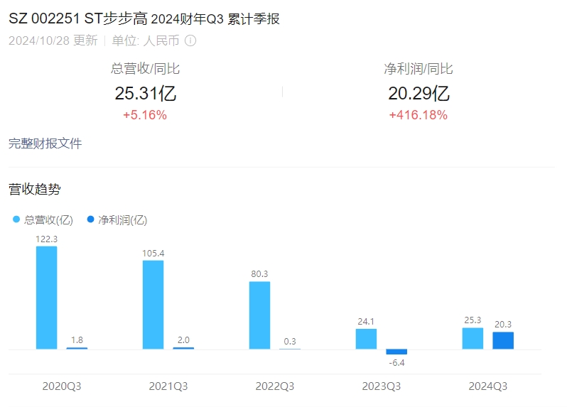 與上述兩家商超的業績表現有所不同,ST步步高在今年第三季度歸屬於上市公司股東的淨利潤達到20.97億元,看上去形勢大好。